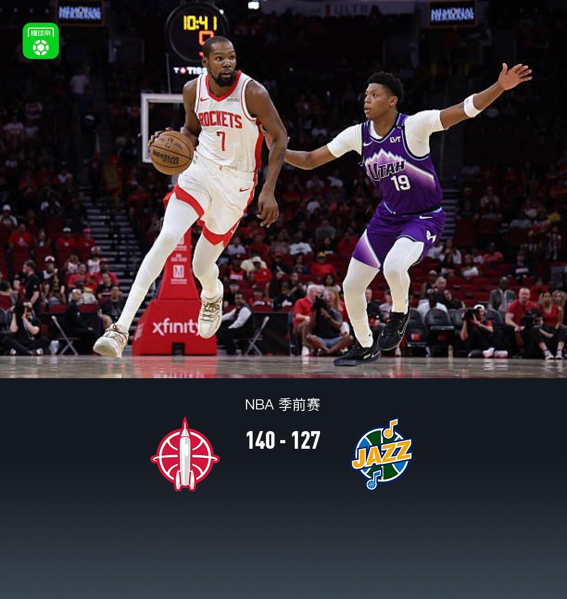 北京时间10月9日NBA 季前赛,休斯顿火箭对阵犹他爵士。半场火箭67-61爵士,最终火箭140-127爵士。休斯顿火箭杜兰特20分2板1助,阿门-汤普森19分7板6助;犹他爵士埃斯-贝利25分6板3助,森萨博24分3板1助。