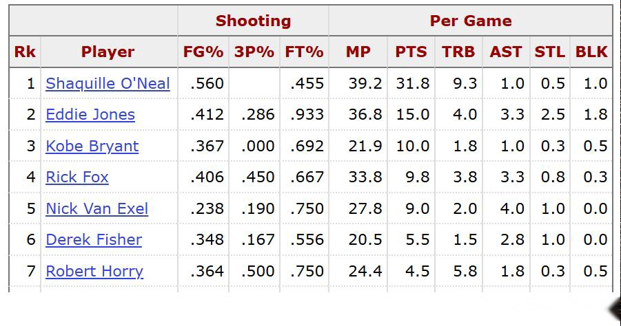 马龙不仅得分效率胜过了奥尼尔,篮板、助攻也胜过了奥尼尔,这就是爵士能够4-0横扫湖人的根本原因。那么这轮比赛其他球员的表现如何呢?先看湖人方面,按照得分多少排序为:埃迪-琼斯场均15分4板3.3助2.5断1.8帽,命中率41.2%,科比场均10分1.8板1助0.3断0.5帽,命中率36.7%,福克斯场均9.8分3.8板3.3助0.8断0.3帽,命中率40.6%,范-埃克塞尔场均9分2板4助1断,命中率23.8%。