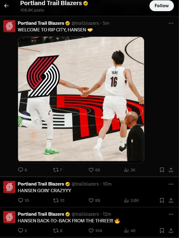 这样精彩的表现也让开拓者官方社媒“为之疯狂”,开拓者官方连续发布三条状态,以称赞杨瀚森的精彩表现。