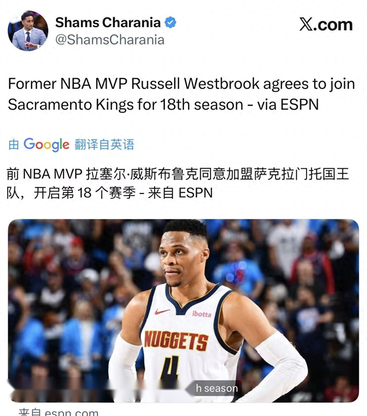 北京时间10月16日,名记Shams的报道称,消息灵通人士透露,拉塞尔-威斯布鲁克已同意加盟国王队。名记克里斯-汉内斯跟进报道,威少和国王队达成的是一份为期1年价值360万美元的老将底薪合同。