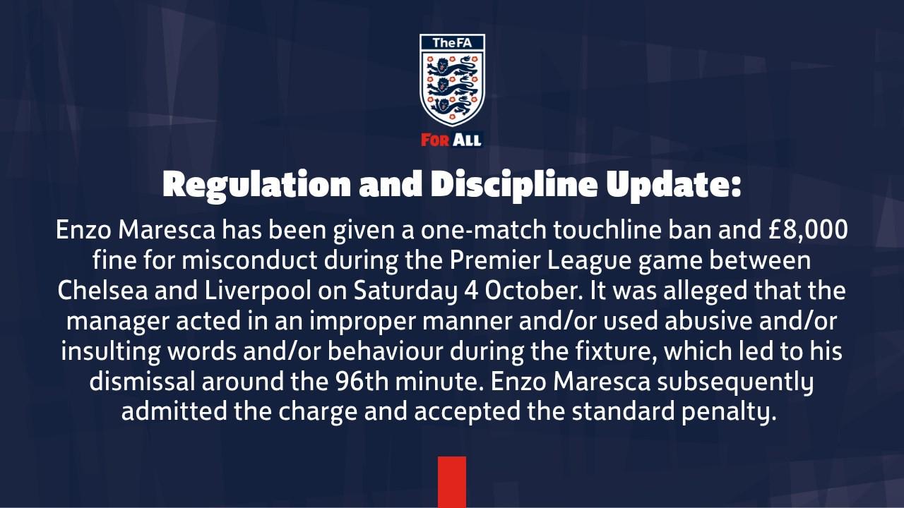 马雷斯卡因为在10月4日切尔西对阵利物浦的比赛中行为不当被禁赛1场并且罚款8000英镑,据称,他在比赛中表现不当,或者使用了侮辱性语言和/或行为,这导致他在第96分钟左右被罚出场。马雷斯卡随后承认了指控,并接受了标准处罚。(公告完)