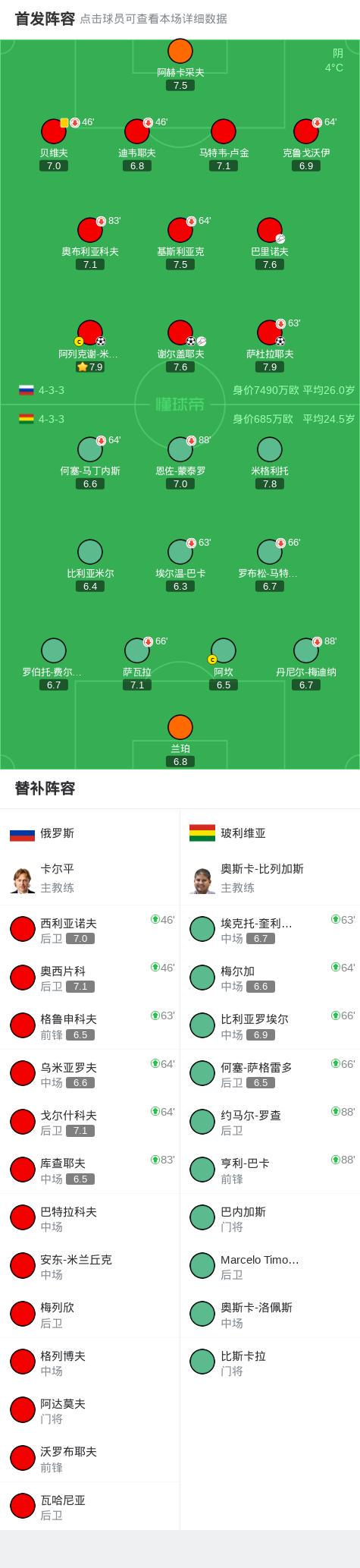 俄罗斯3-0大胜玻利维亚,谢尔盖耶夫1射1传,阿列克谢-米兰丘克建功