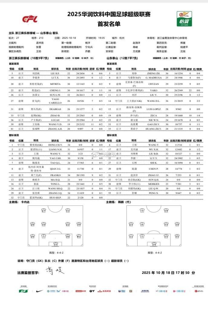 北京时间10月18日19:35,中超联赛第27轮,浙江主场迎战山东,赛前双方公布首发阵容: