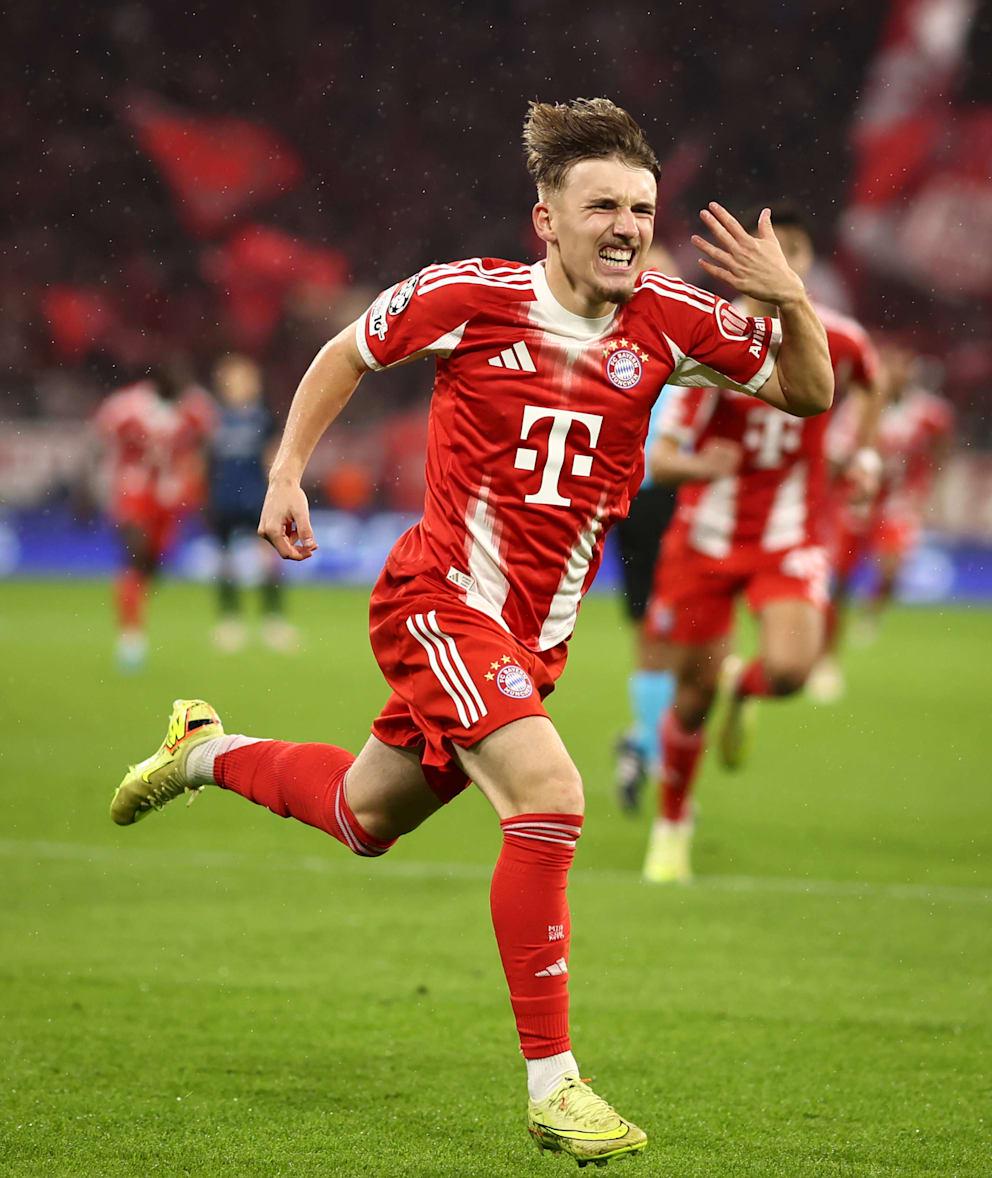 拜仁慕尼黑的伦纳特-卡尔(17岁)首次在欧冠联赛中首发登场。仅仅四分钟后,他带球突破,让两名布鲁日球员像木偶一样被晃倒在地,接着又绕过三名比利时防守队员,随后用左脚在大约17米外打出一记势不可挡的远射,皮球直挂死角,将比分改写为1:0。这是一粒疯狂的进球,整个安联球场都沸腾了!