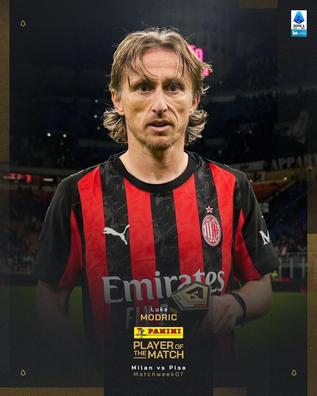官方消息,莫德里奇当选米兰对阵比萨一役全场最佳。