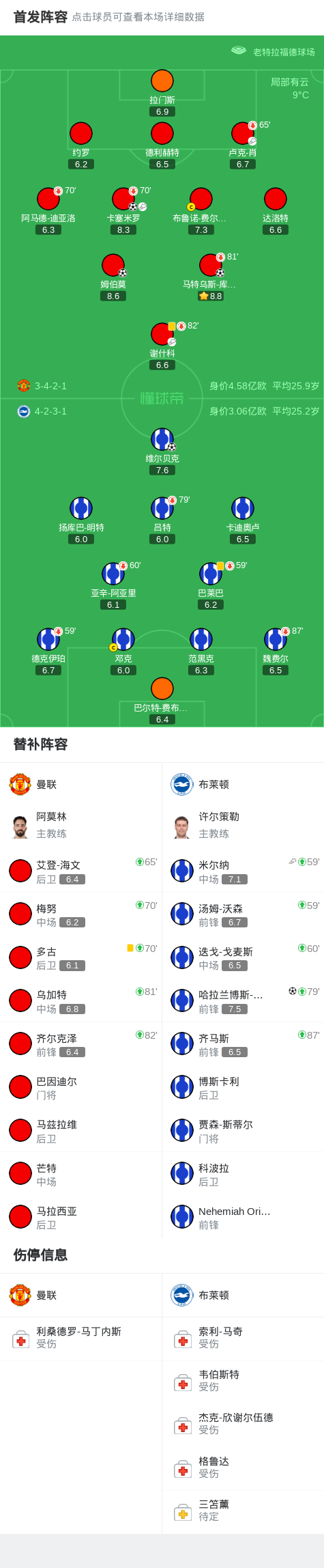 北京时间10月26日英格兰足球顶级联赛 联赛 第9轮,曼联主场对阵布莱顿。曼联马特乌斯-库尼亚破门,卡塞米罗破门,姆伯莫破门。布莱顿维尔贝克破门,哈拉兰博斯-科斯图拉斯破门。最终比分曼联 4-2 布莱顿。