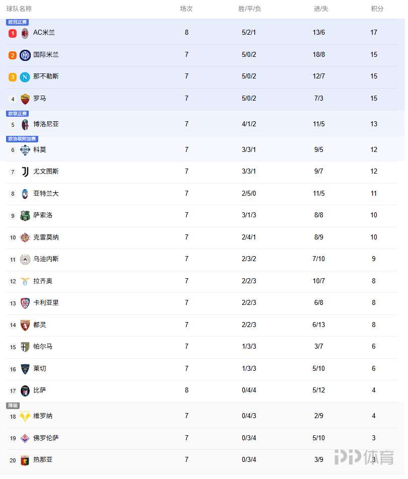 意甲第8轮,米兰先赛2-2战平比萨。米兰先赛只领先国米2分,后者本轮将客战那不勒斯。