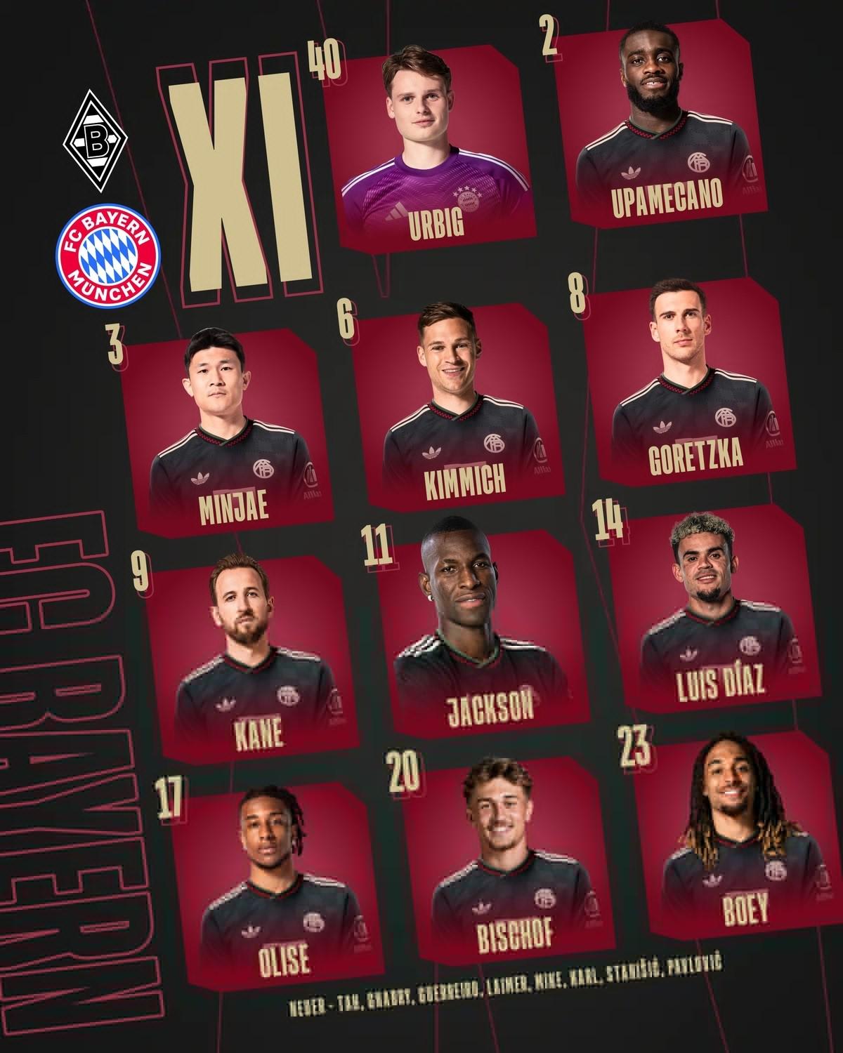 拜仁客战门兴:凯恩、雅克松首发,格雷茨卡、金玟哉出战