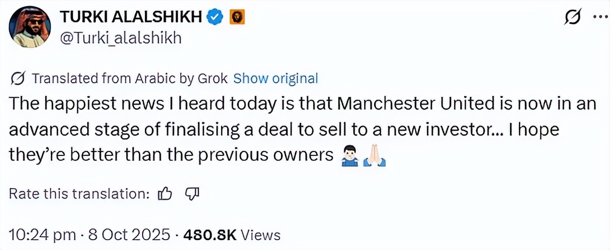 谢赫在社交媒体表示,“我今天听到的最让人高兴的消息是,曼联现在处于完成向新投资者出售的交易后期阶段,我希望他们比之前的老板更好。”