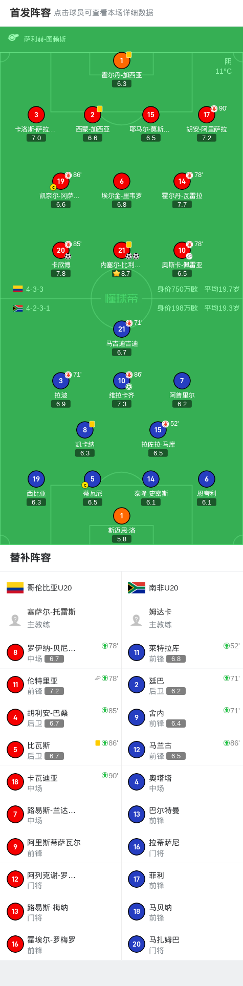 哥伦比亚U20 3-1南非U20,内塞尔-比利亚雷亚尔两球,卡欣博破门