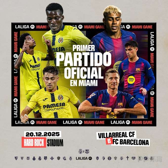 西班牙甲级联赛官方宣布,2025-26赛季西甲EA体育联赛第17轮比利亚雷亚尔对阵巴塞罗那的比赛将于2025年12月20日在美国佛罗里达州迈阿密市的硬石体育场举行。