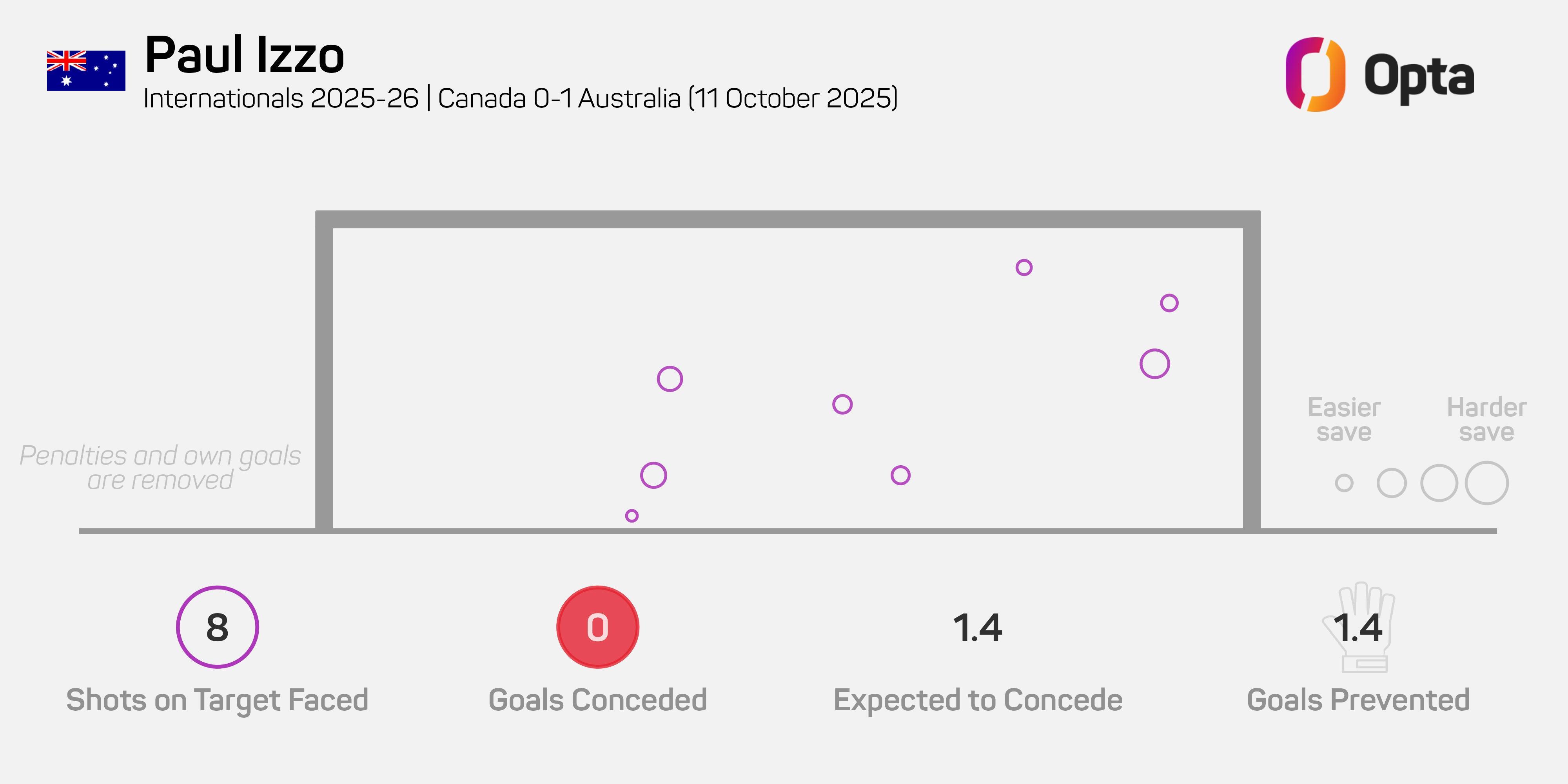 对加拿大比赛,门将伊佐完成8次扑救创澳大利亚队史单场扑救纪录