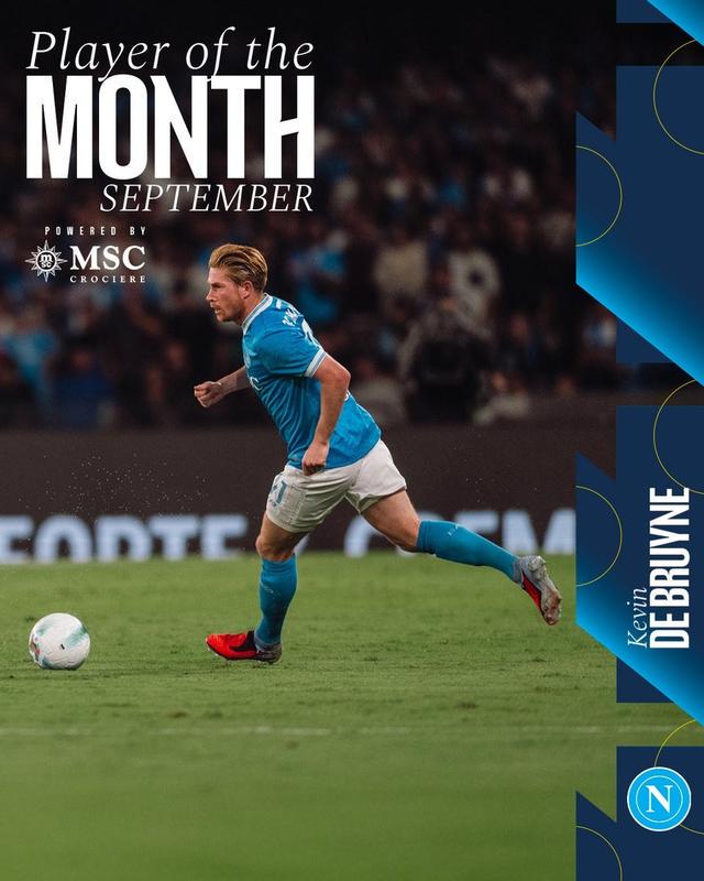 官方消息,德布劳内当选那不勒斯9月最佳球员。