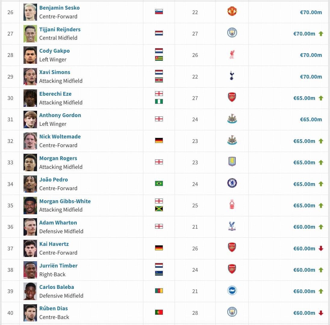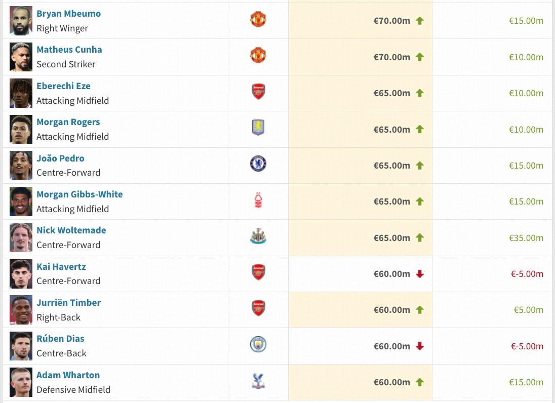 英超身价变更:维尔茨降至1.3亿欧,萨卡降至1.4亿欧,凯塞多升至1亿欧